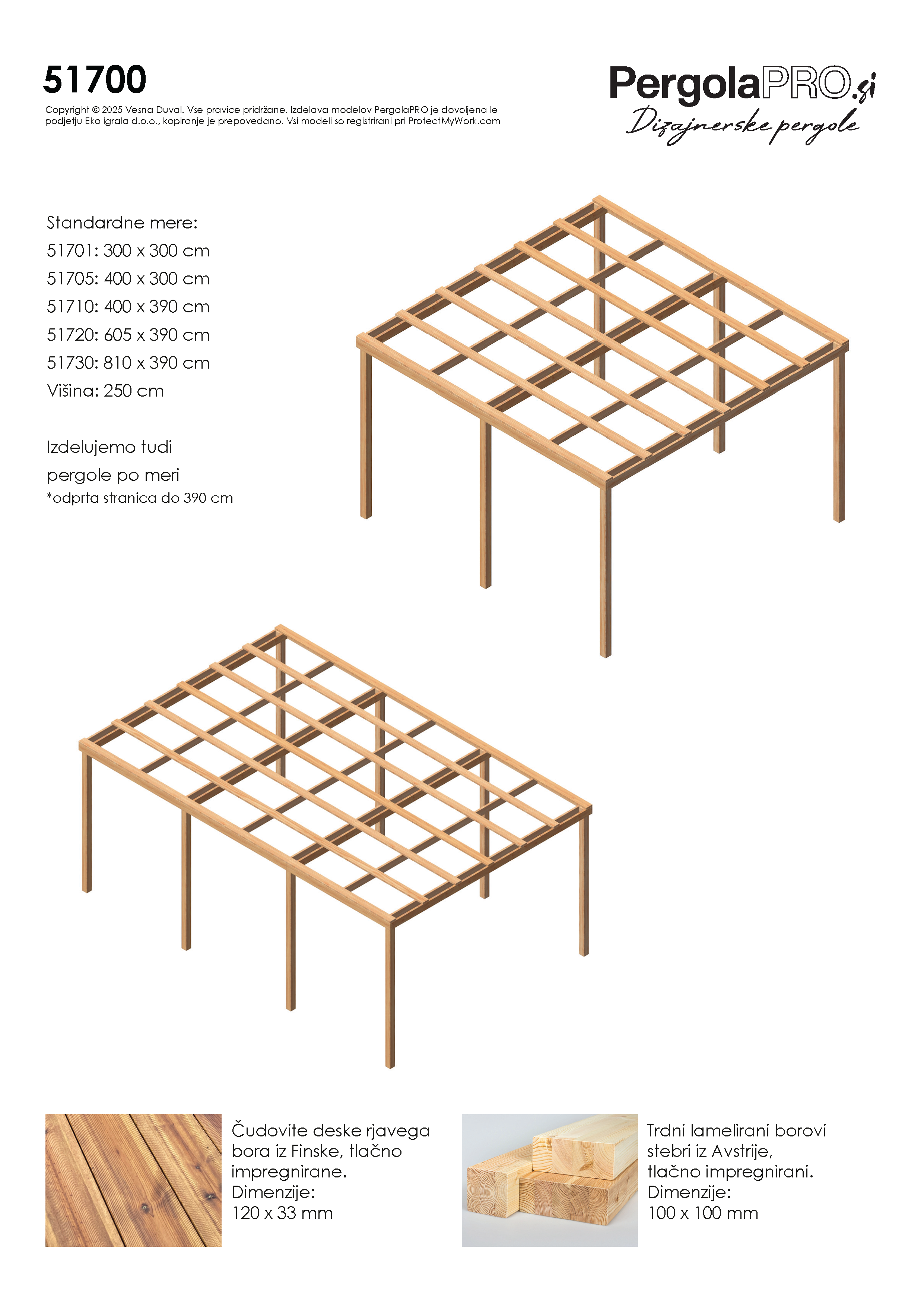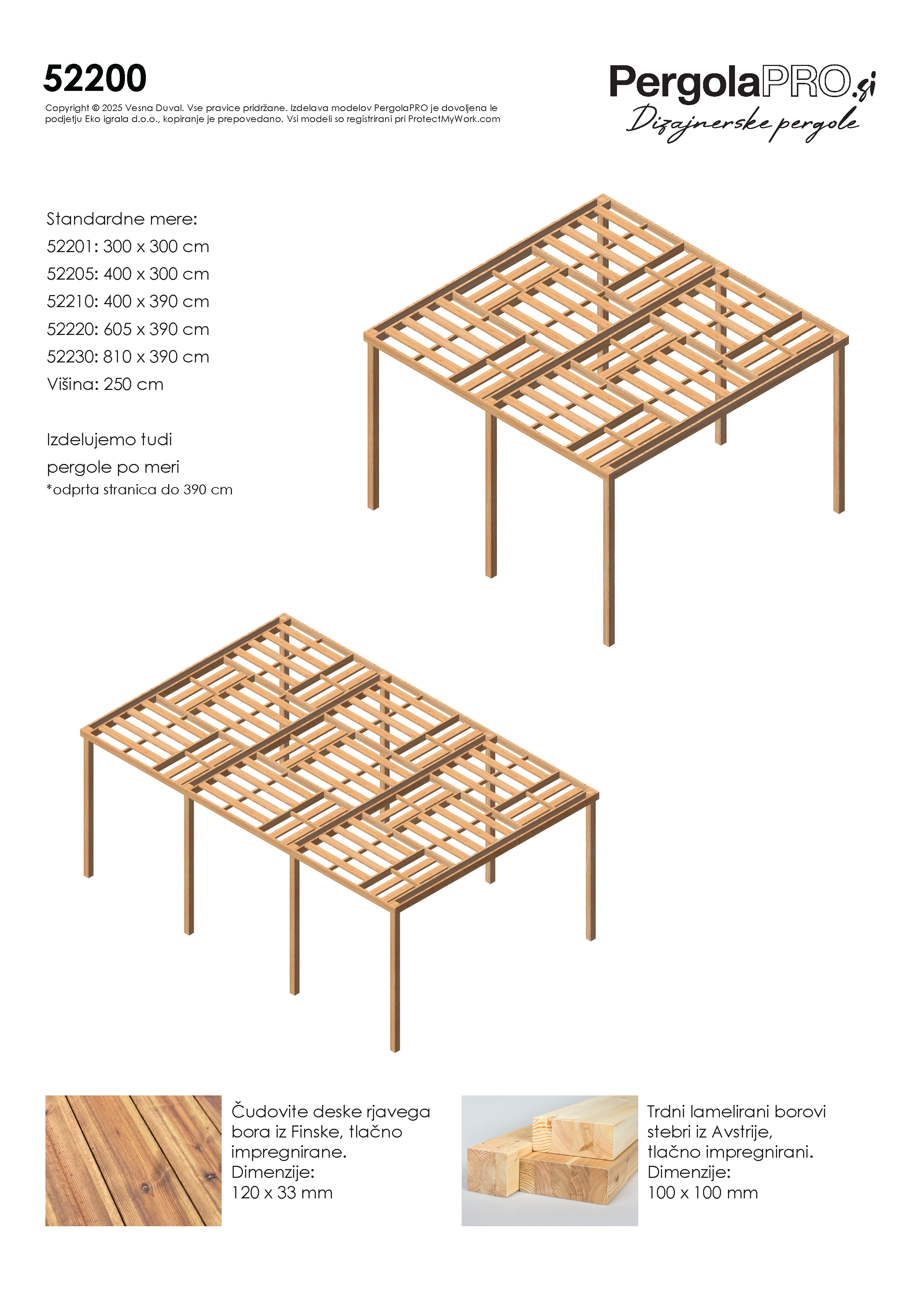 Na tej strani si lahko ogledate različne modele lesenih pergol, ki jih izdelujemo v navedenih merah ali v merah po naročilu. Vsaka pergola je unikatna in prilagojena potrebam naročnika.